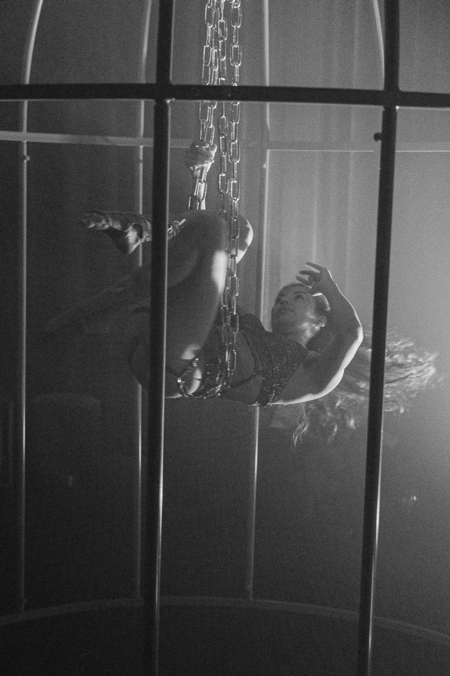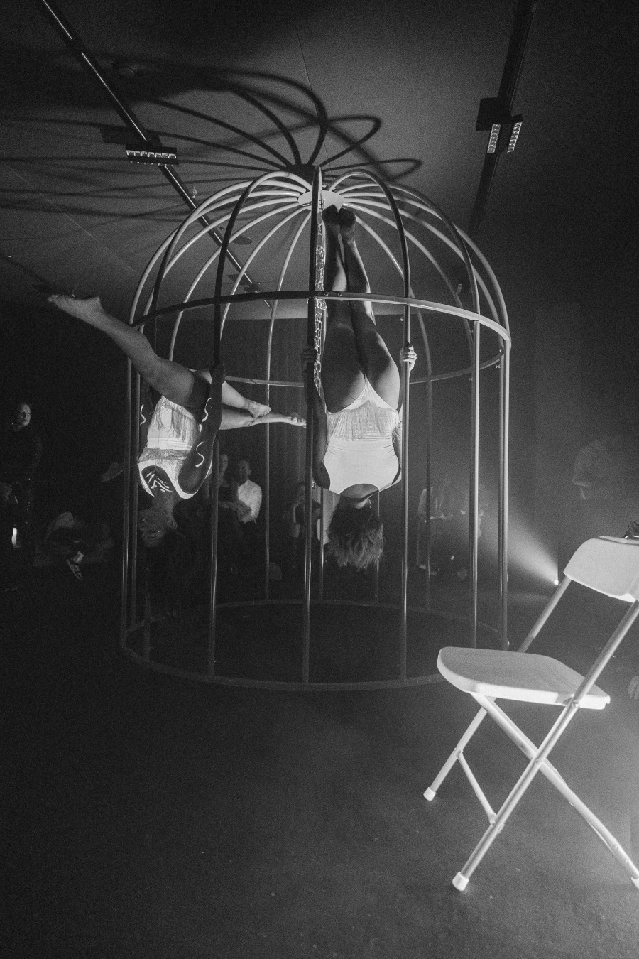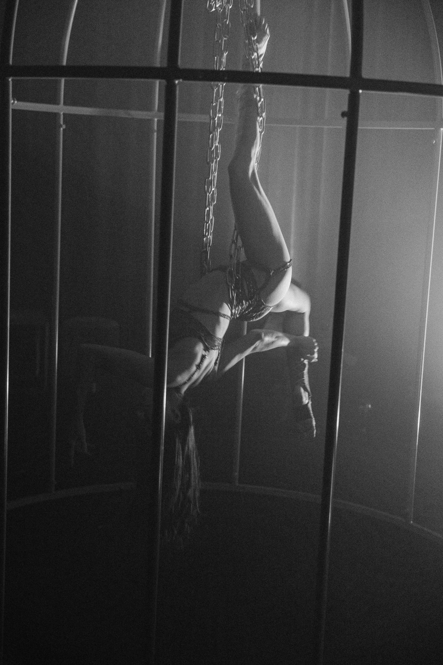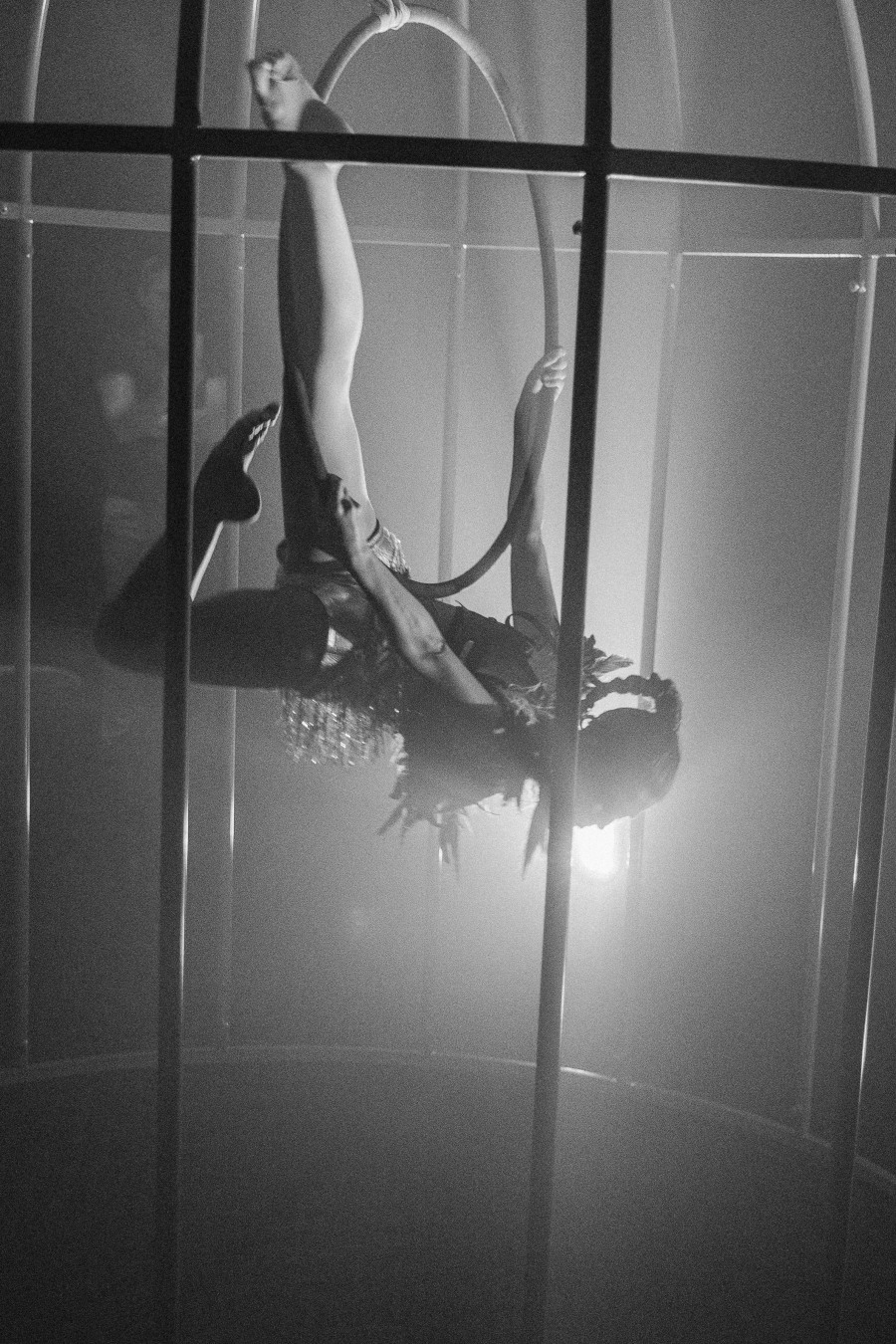 Акробатиката в клетка е впечатляващо и динамично шоу, което съчетава сила, елегантност и театралност. Един или повече артисти изпълняват ефектни акробатични номера върху самата клетка или с помощта на въздушни уреди като обръч, воали, вериги, хамак и други. Този тип представление създава мистична и завладяваща атмосфера, подходяща за клубни вечери, гала събития и тематични партита, където се търси зрелищност и емоция.