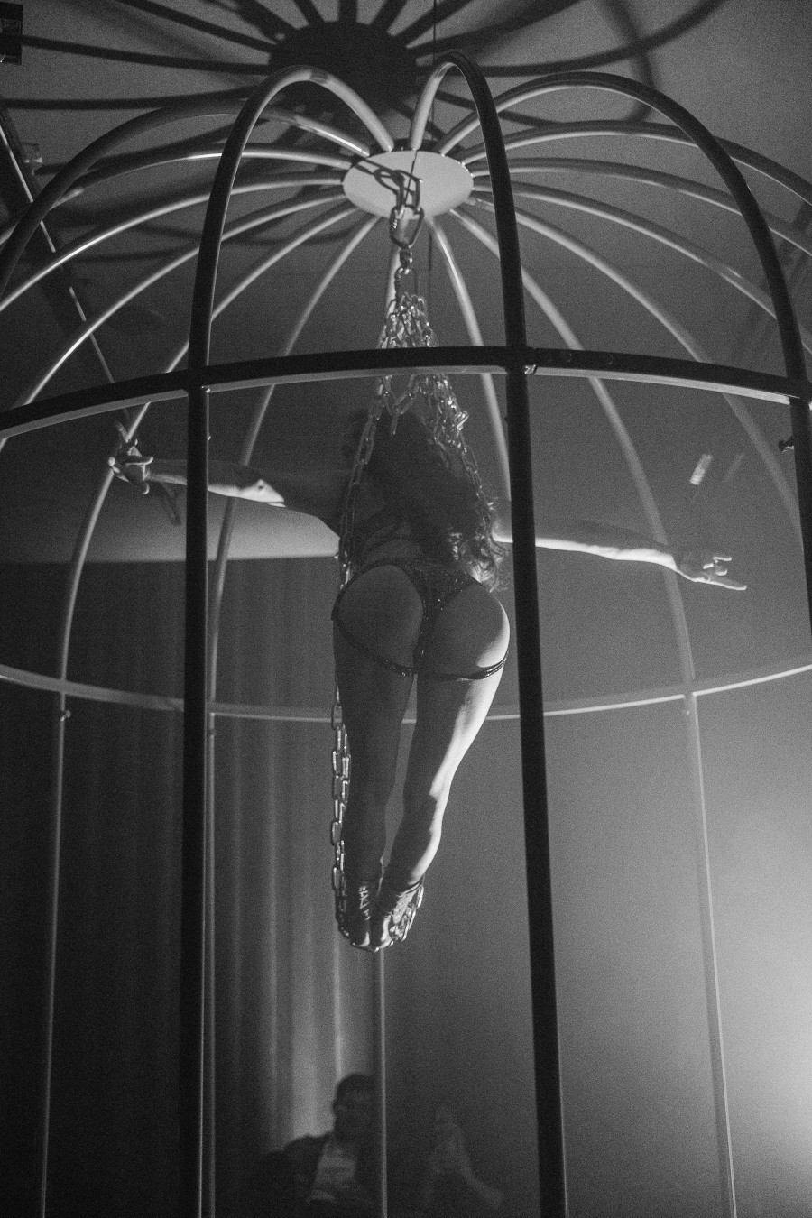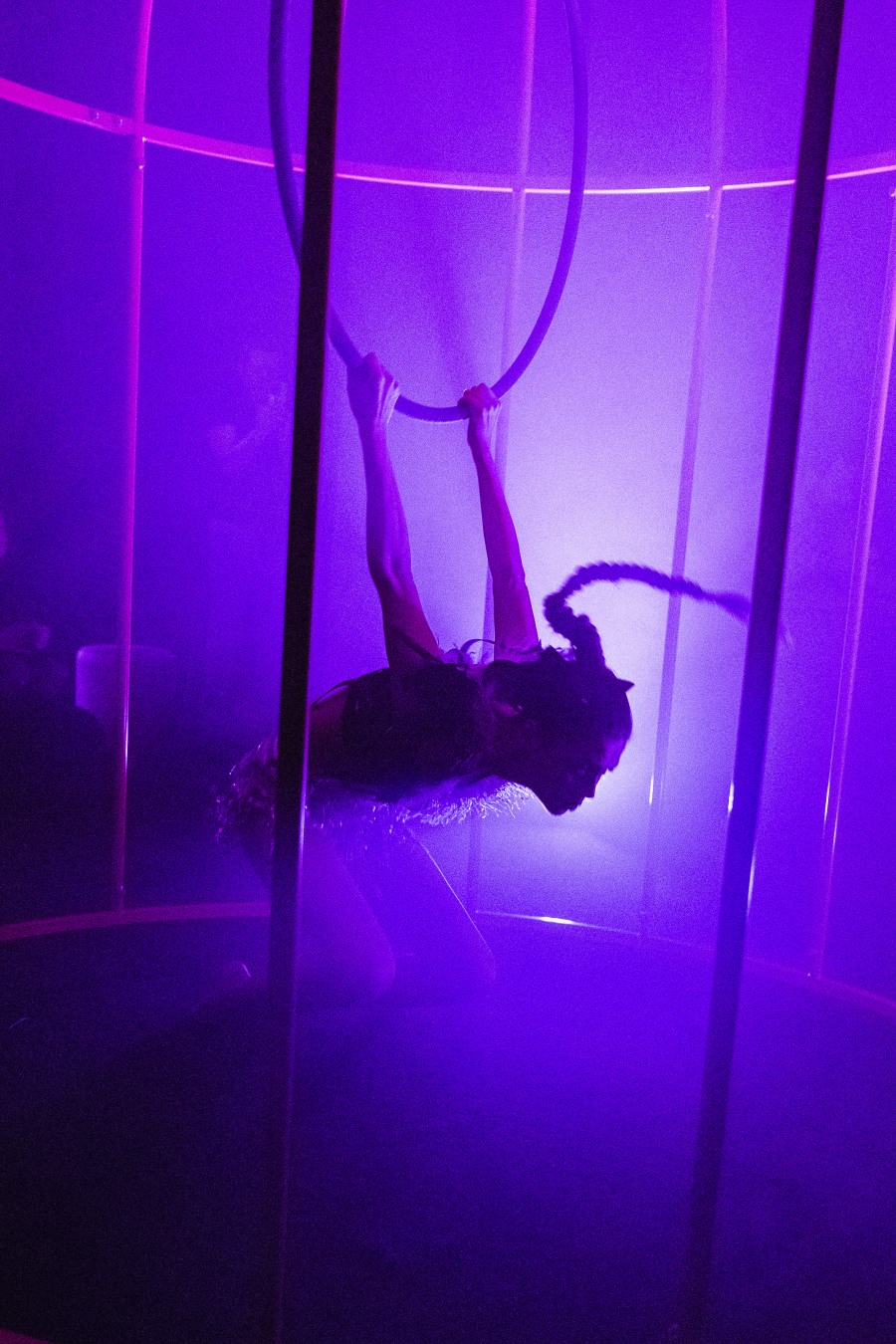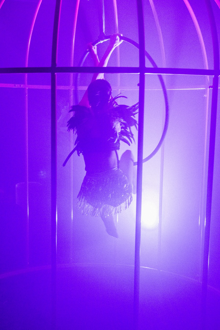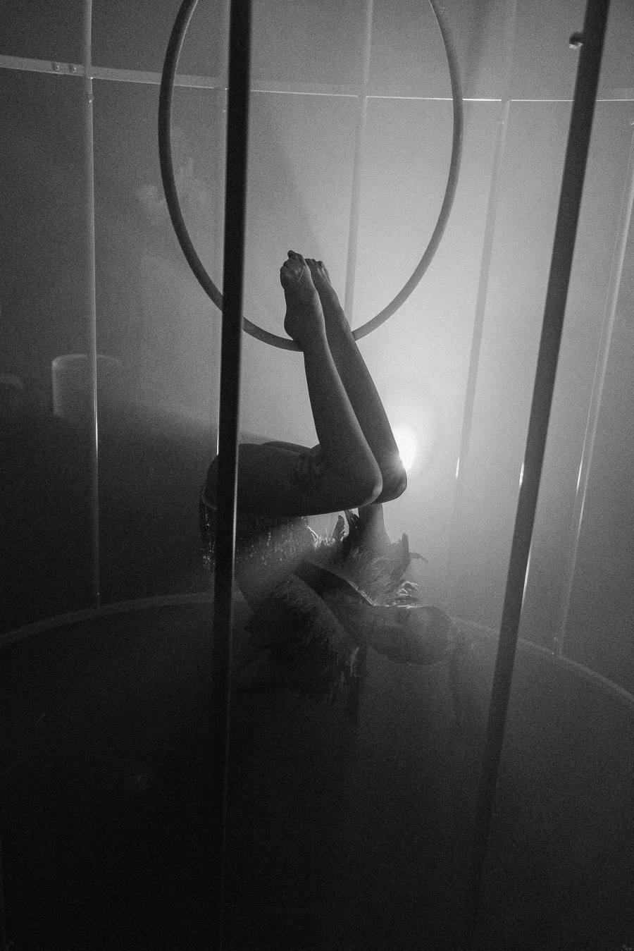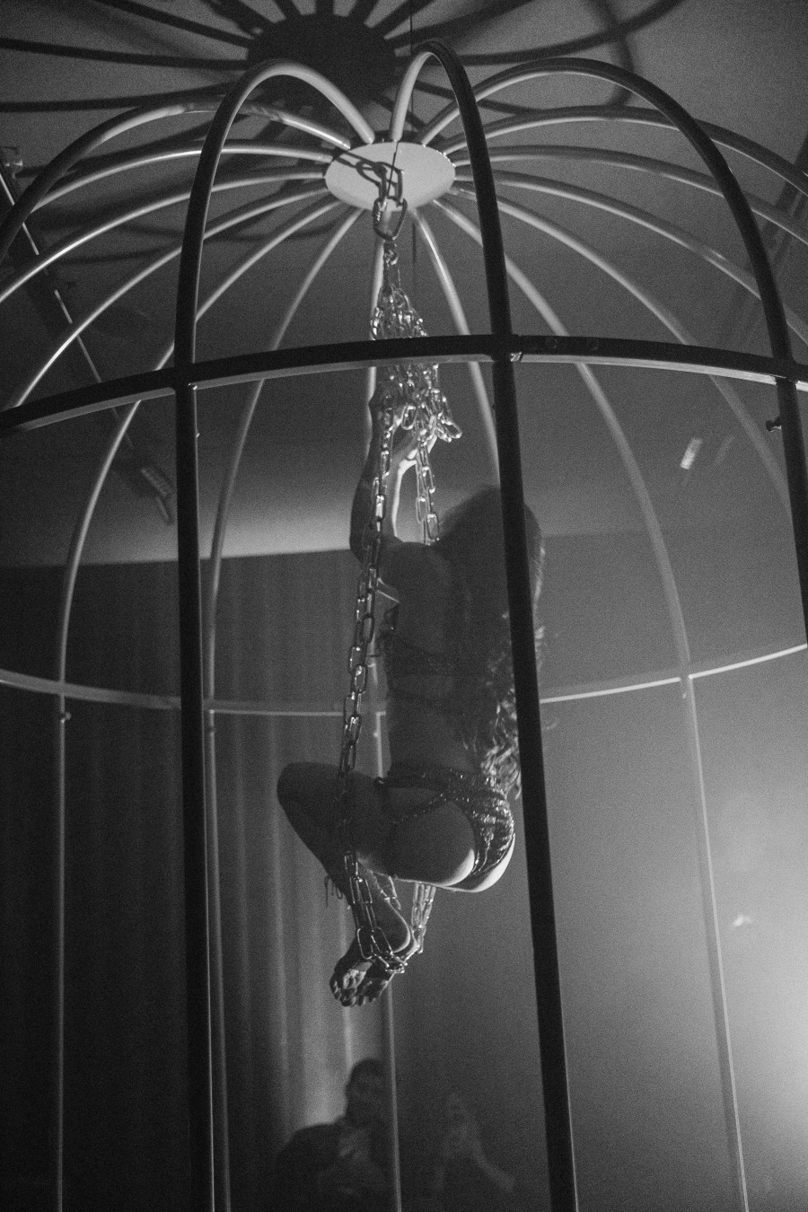 Акробатиката в клетка е впечатляващо и динамично шоу, което съчетава сила, елегантност и театралност. Един или повече артисти изпълняват ефектни акробатични номера върху самата клетка или с помощта на въздушни уреди като обръч, воали, вериги, хамак и други. Този тип представление създава мистична и завладяваща атмосфера, подходяща за клубни вечери, гала събития и тематични партита, където се търси зрелищност и емоция.